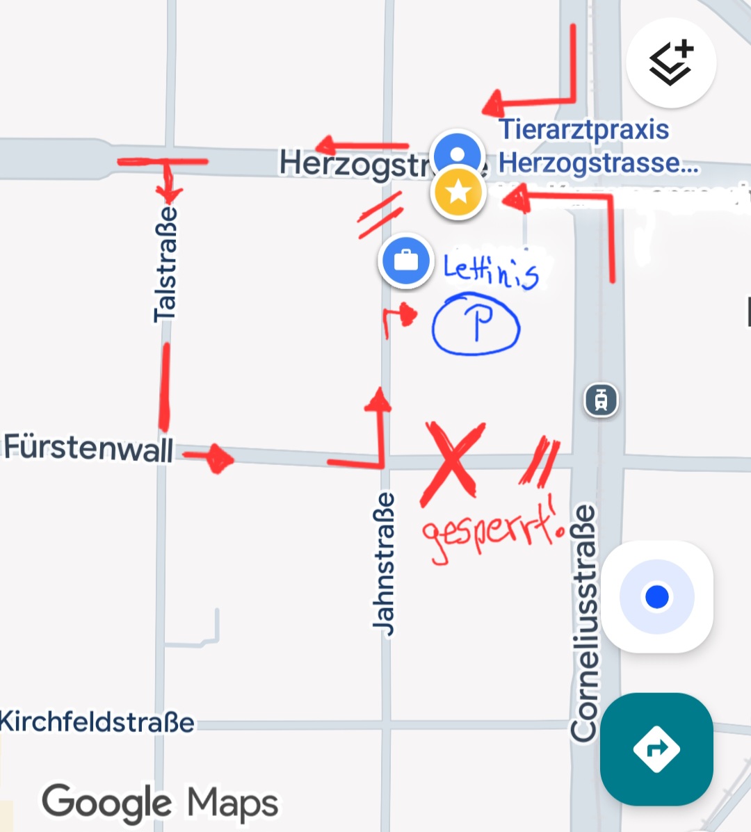 ABER!!!: von der Corneliusstr. kommend ist der Fürstenwall immer noch gesperrt! Da also über die Herzogstr. durch die Talstr. zum Fürstenwall fahren!